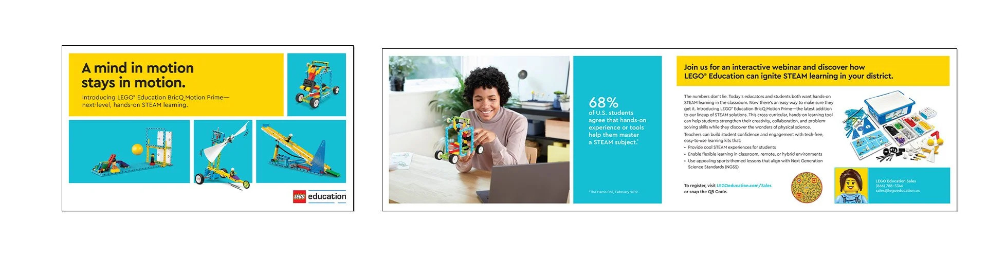 The campaign featured a custom die-cut teaser postcard—shaped like stacked 2x4 LEGO bricks—to spark curiosity and build anticipation for the follow-up dimensional mailer. The second piece included a bellyband, product sample, and compact brochure, all designed to highlight the value of STEAM education and its real-world learning outcomes.