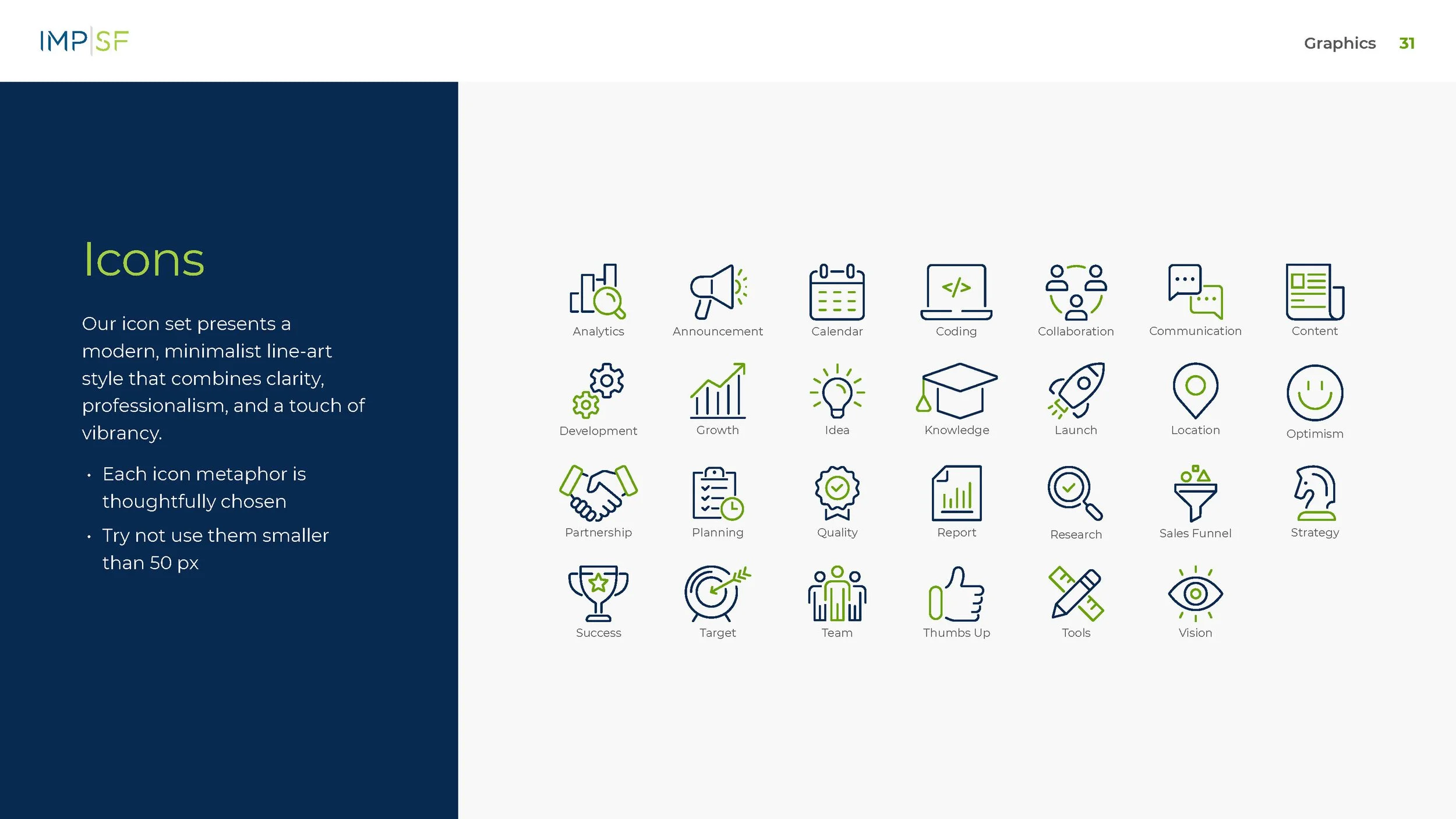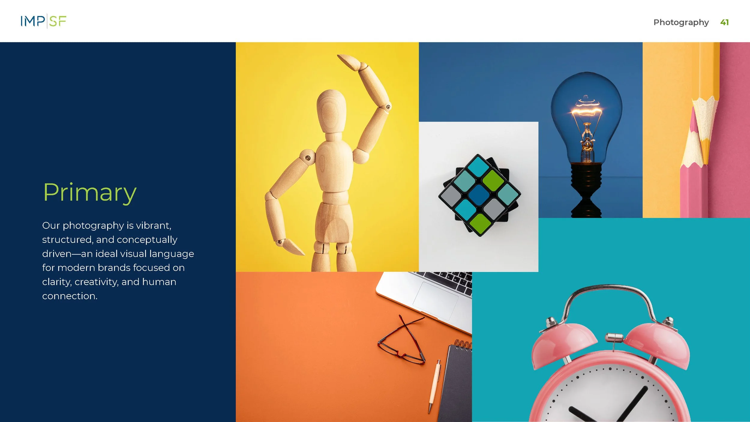 IMP-SF wanted to modernize its branding and develop a larger library of images and icons to help internal teams create more consistent and visually engaging presentation decks.